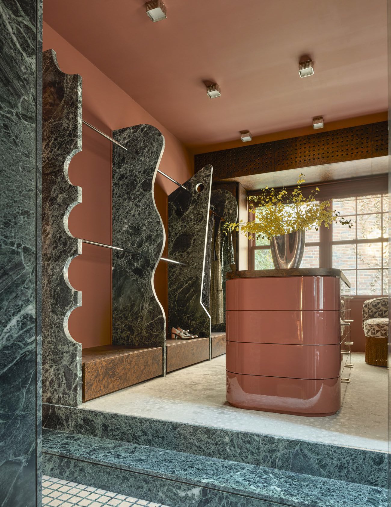 The narrow profiles of our STL-W75 system mean more glass, less frame, and consequently, more of that coveted autumn light flooding the interior spaces. Greg Natale's bold color palette of rich terracottas, dusty roses, and sage greens, seems almost prescient in its autumnal resonance. Against the backdrop of changing leaves visible through the oversized steel windows, the interior becomes a curated celebration of the season itself.