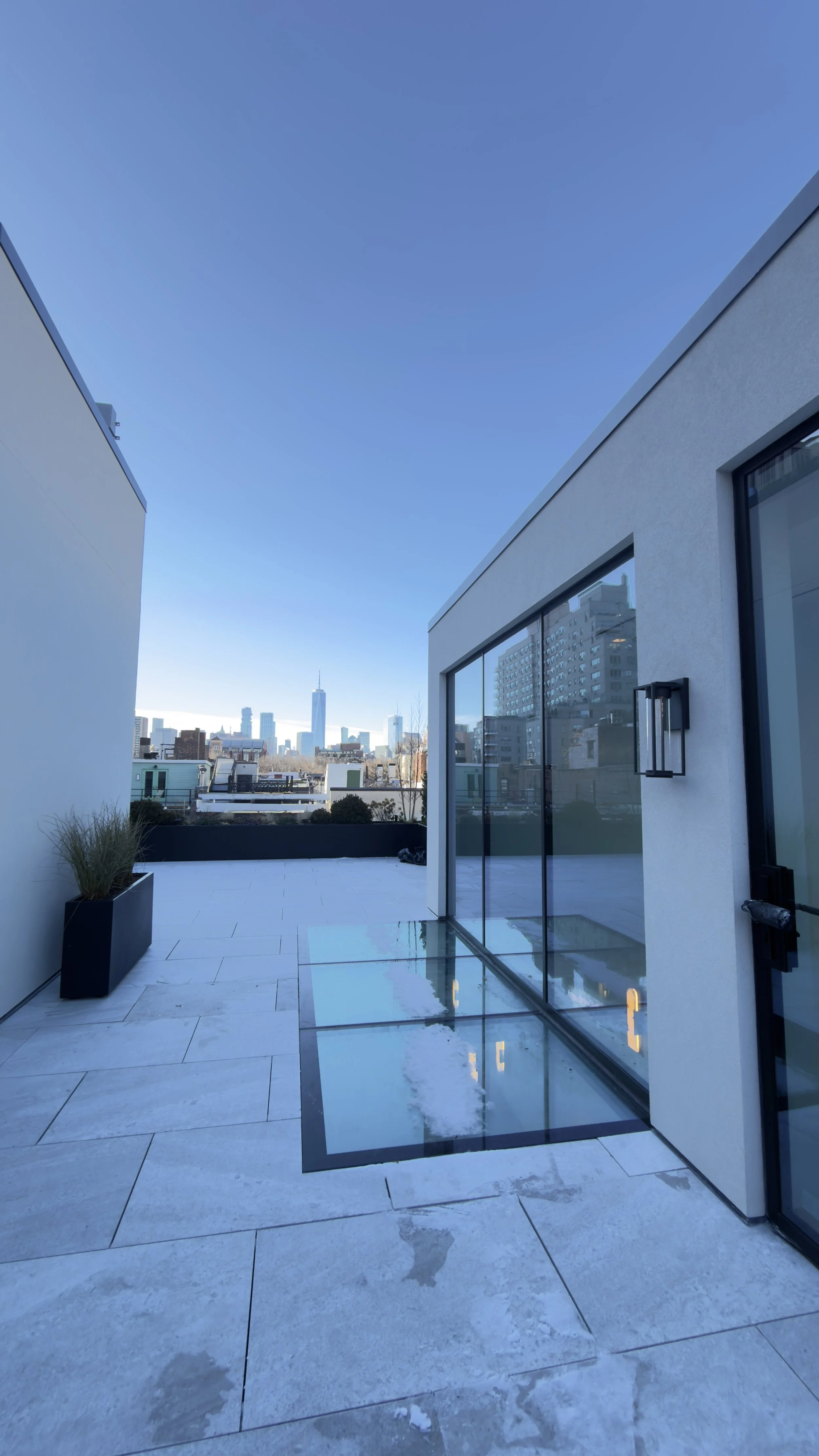 The result is a home that belongs to New York. Light arrives from every direction - through the walls, underfoot, and overhead - held in place by steel that never apologizes for being exactly what it is. Casement windows open wide on warm evenings; fixed windows dissolve into pure glass and view; sliding doors disappear into the wall to create openings as generous as the city's parks. And the walkable skylight, the project's most unexpected move, sends light one floor below as a shifting pattern that changes with the hour and the season — a floor that is also a sky.